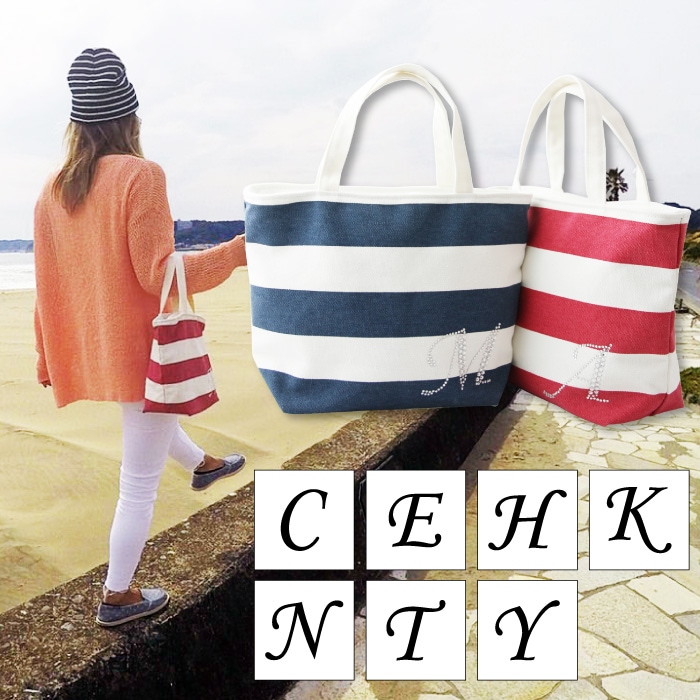 イニシャルバッグ ラインストーン ボーダー柄 Mサイズ チャック付 イニシャルトートバッグ ミニバッグ ミニトートバッグ エコバッグ バック ポーチ